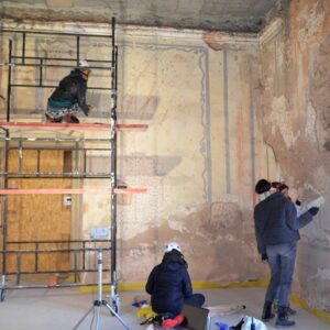 Efektem nawiązanej współpracy były kolejne zajęcia terenowe, tym razem dla studentek III roku. W dniach od 11 do 13 Kwietnia 2022 gościliśmy asystentki PKiRMŚ: mgr Reginę Główczak i mgr Karolinę Molgę oraz 13 studentek. Prace odkrywkowe były prowadzone w salach I piętra Pałacu Struga. Była to kontynuacja odkrywek nawarstwień malowideł ściennych, w sali balkonowej, jadalni oraz w salach w skrzydle wschodnim. Czekamy jeszcze na zakończenie analizy pobranych próbek tynku i farb ale już wiemy, że tych salach mamy 2 warstwy tynków renesansowych z malowidłami na całej powierzchni ścian, oraz kolejne warstwy malarskie z okresu baroku, klasycyzmy i XIX wieku.