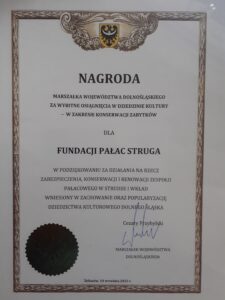 Prezes fundacji Pałac Struga – Agnieszka Chmura-Wieczorek w dniu 10.09.2022 z rąk Członka Zarządu Województwa Dolnośląskiego pana Krzysztofa Maja odebrała Dyplom za wybitne osiągnięcia w dziedzinie kultury w zakresie konserwacji zabytków.
