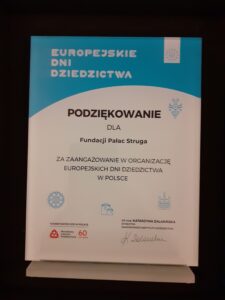 Dyrektor Narodowego Instytutu Dziedzictwa dr hab. Katarzyna Zalasińska wręczyła pamiątkowe tabliczki/dyplomy dla wyróżniających się organizatorów EDD oraz dla koordynatorów projektu. Jednym z wyróżnionych organizatorów na terenie województwa dolnośląskiego była Fundacja Pałac Struga. Prezes Fundacji – Agnieszka Chmura-Wieczorek osobiście odebrała dyplom dla fundacji za organizowanie EDD w Pałacu Struga. Fundacja Pałac Struga co roku, począwszy od 2017 r. organizuje wydarzenia historyczno-edukacyjne w ramach EDD.